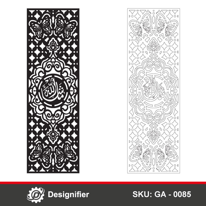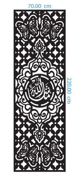 Butterfly Diamonds Door DXF GA0085 vector design showcases a beautifully balanced ornamental pattern, ideal for laser cutting or CNC projects. The artwork features a central Arabic calligraphy element gracefully enclosed within a circular frame, surrounded by intricate geometric motifs that add depth and harmony to the composition. Floral and scroll-like curves radiate outward from the…