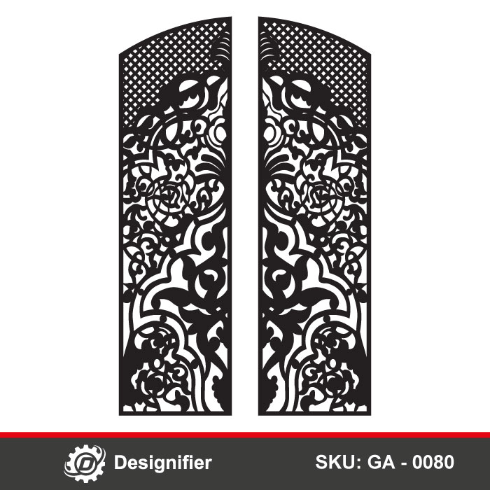 The Lattice Dense Filigree Gate DXF GA0080 vector design depicts symmetrical door panels with bold borders and arched tops, featuring an open lattice pattern on the upper section for balanced light and strength. The main panel is richly decorated with flowing arabesque scrolls and floral motifs, blending traditional Middle Eastern aesthetics with modern precision cutting.…